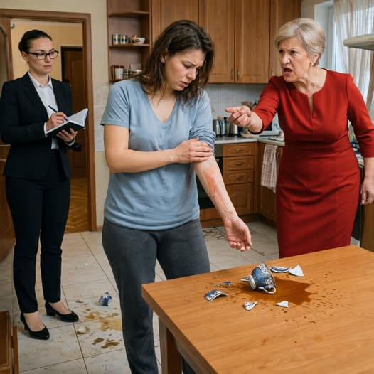 Свекровь швырнула в меня чашку с горячим чаем со словами: «Знай своё место!» Она не знала, что в соседней комнате сидит сотрудник опеки